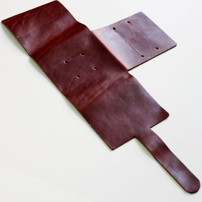 С помощью линейки и ножа отрежьте крой. Не снимая лекала с кожи, по заранее сделанным отверстиям пробейте дырки пробойником 2 мм, и сделайте прорези. Ручкой для разметки обведите все закругления и ножницами по коже, аккуратно обрежьте.