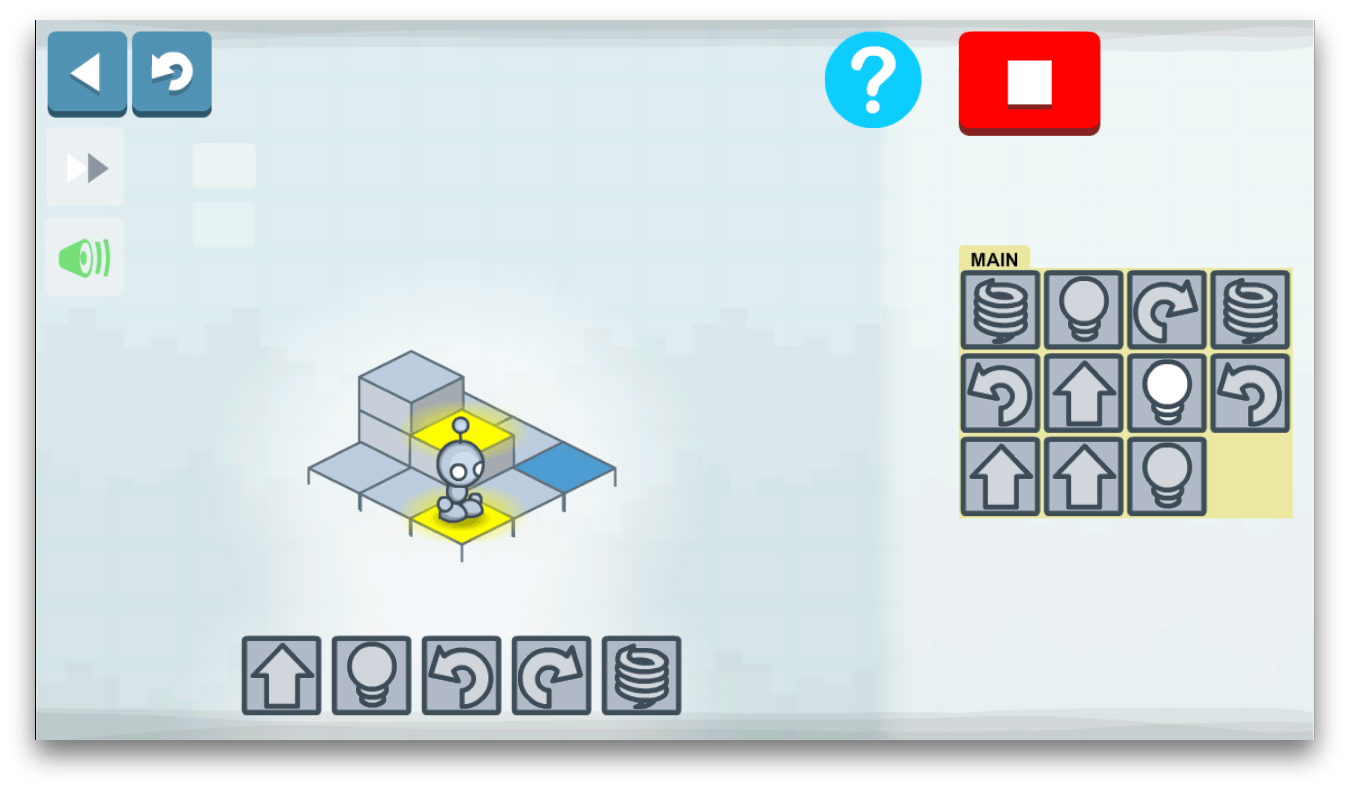 В игре, доступной на смартфоне или планшете, маленький робот, подчиняясь командам, должен зажечь в нужных местах лампочки. Главная задача, которая при этом будет стоять перед ребёнком, - спроектировать путь игрушки при помощи простых команд. Задача родителя - объяснить малышам, что означают картинки.