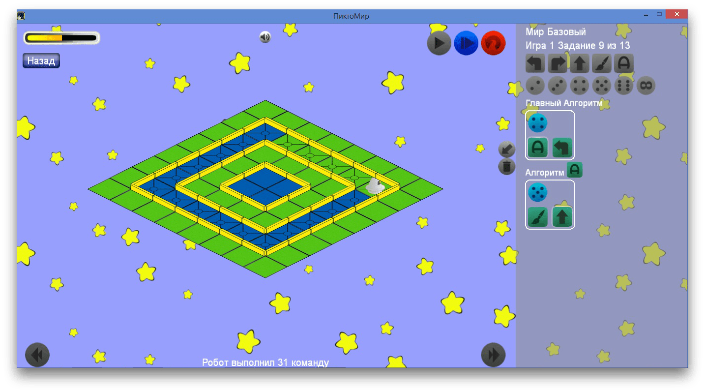 Робот раскрашивает поля, а ребёнок учится составлять алгоритмы. Все подсказки выполнены с помощью графики, поэтому «ПиктоМир» можно спокойно давать детям, не умеющим читать, начиная с пяти лет: заметно, что учёные постарались сделать действия понятными даже для малышей. Если родители не знают английского языка и ничего сами не понимают в программах, но очень хотят развивать логическое мышление у детей, «ПиктоМир» будет настоящим спасением. Мобильные версии доступны для iOS, Android и Windows Phone, но скачивать последние две придётся с сайта разработчика.